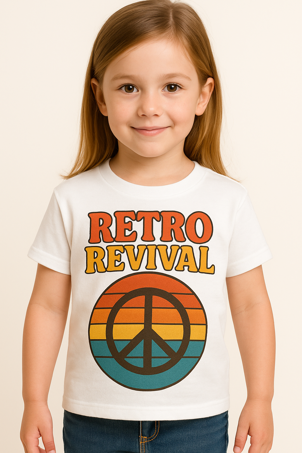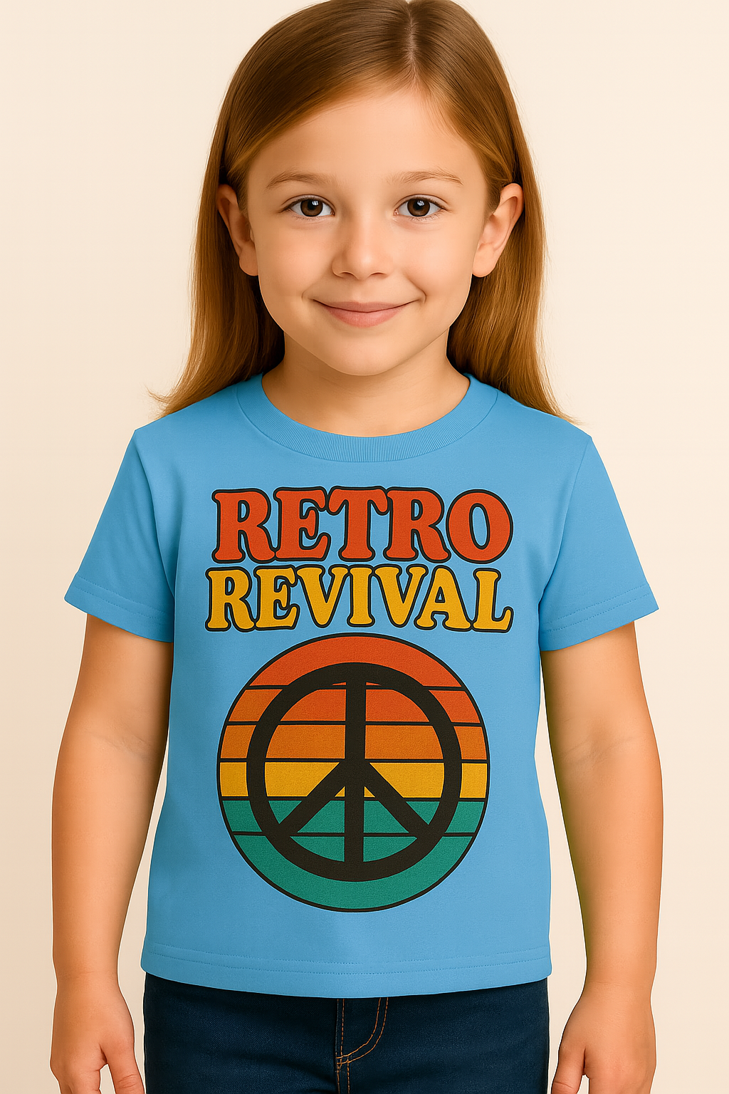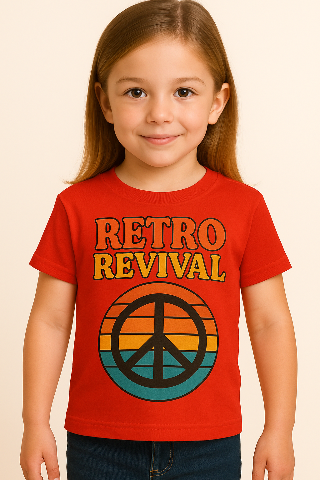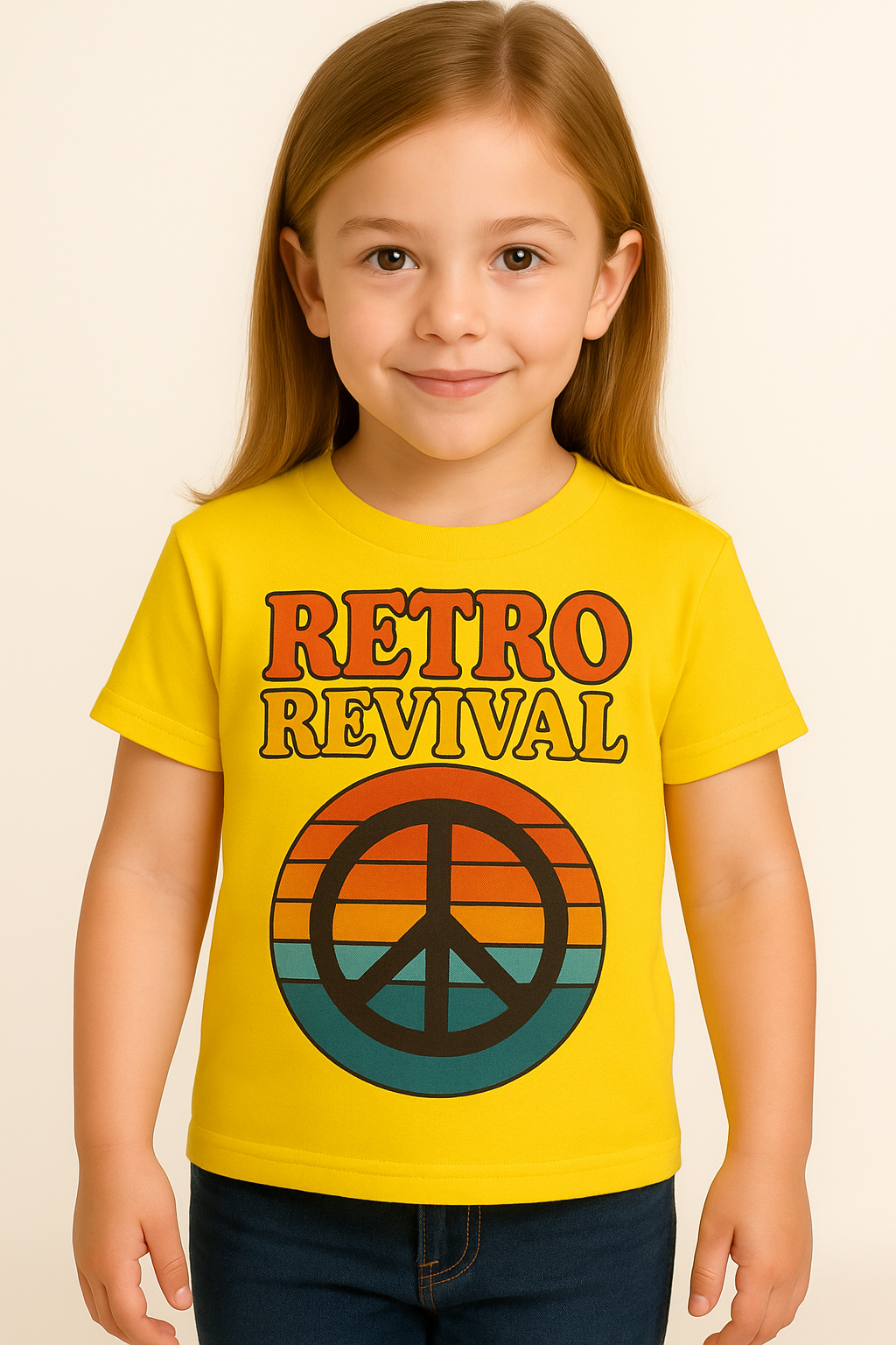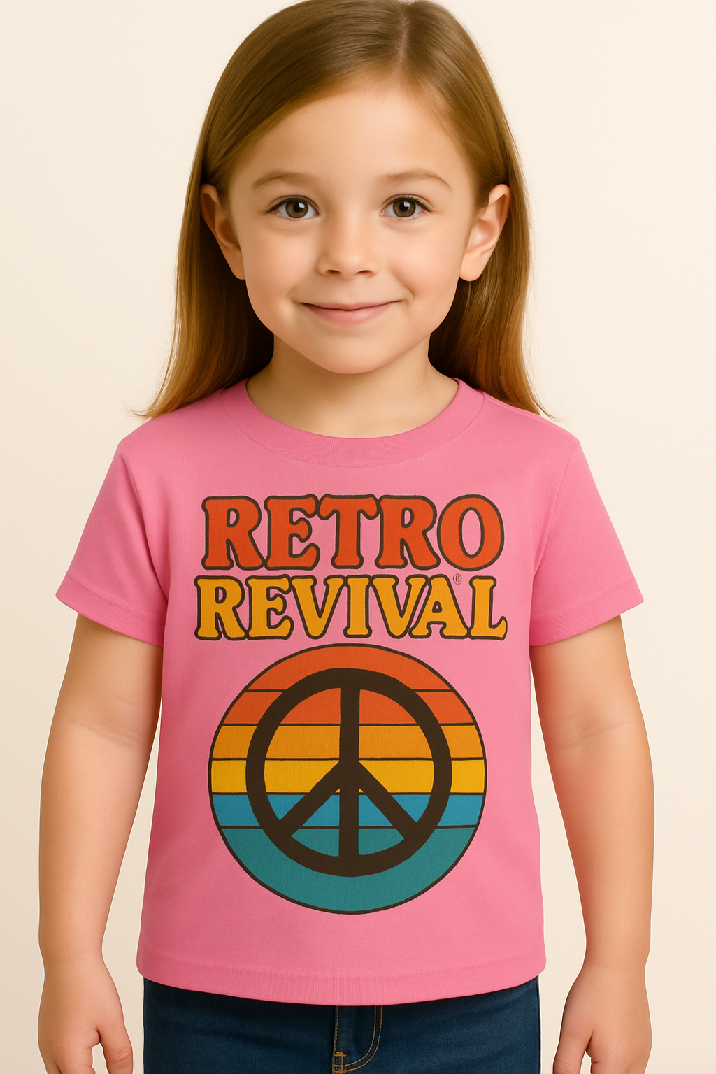Add a groovy twist to your kid’s style with this vibrant “Retro Revival” T-shirt, featuring a bold peace sign and vintage colors on soft, comfy cotton.