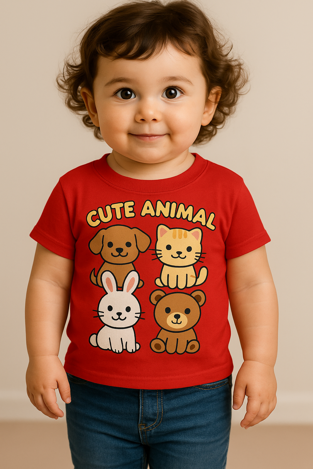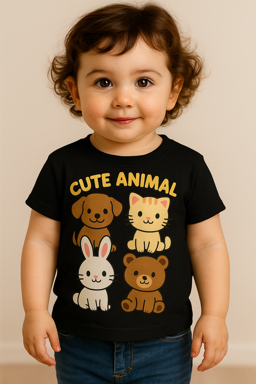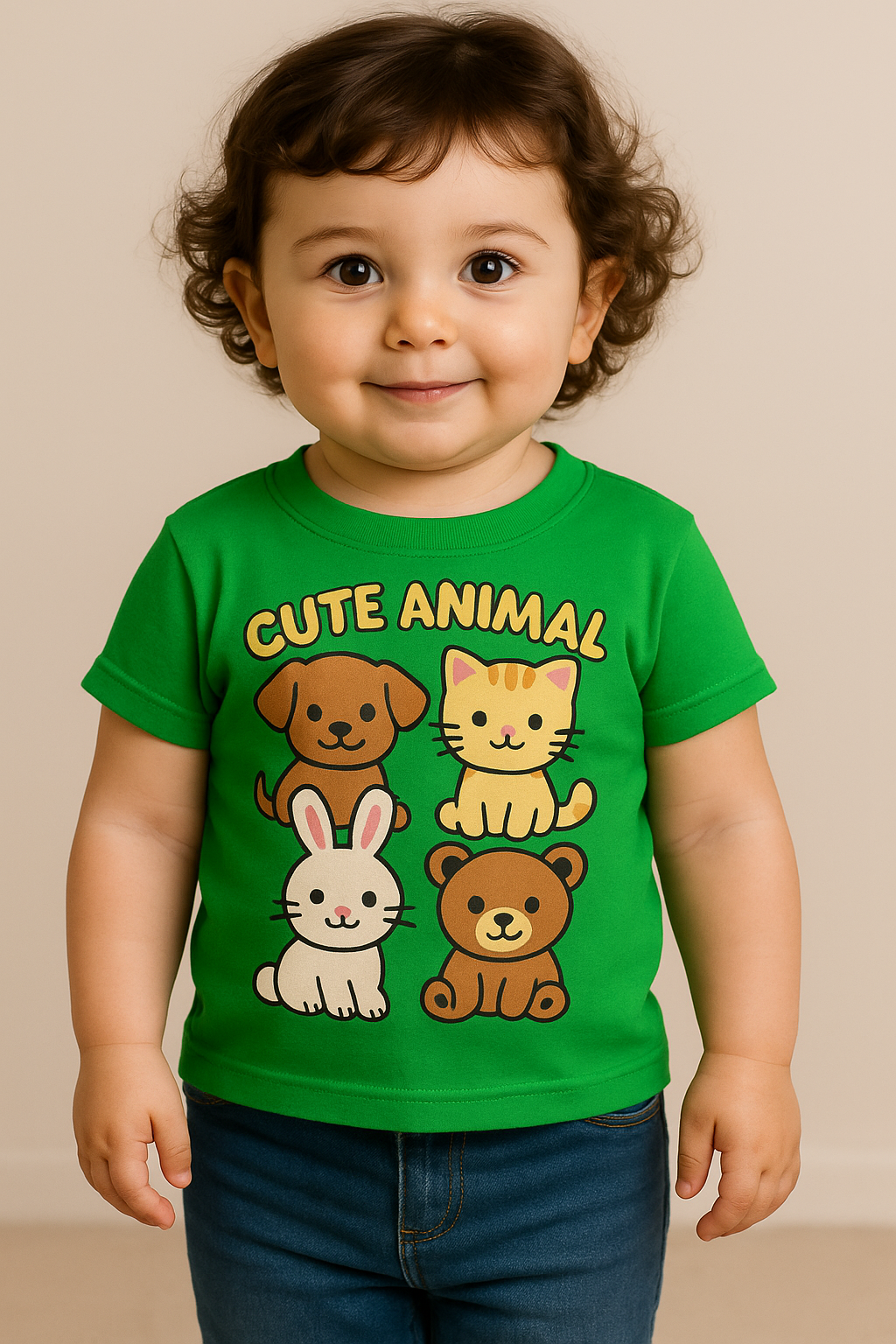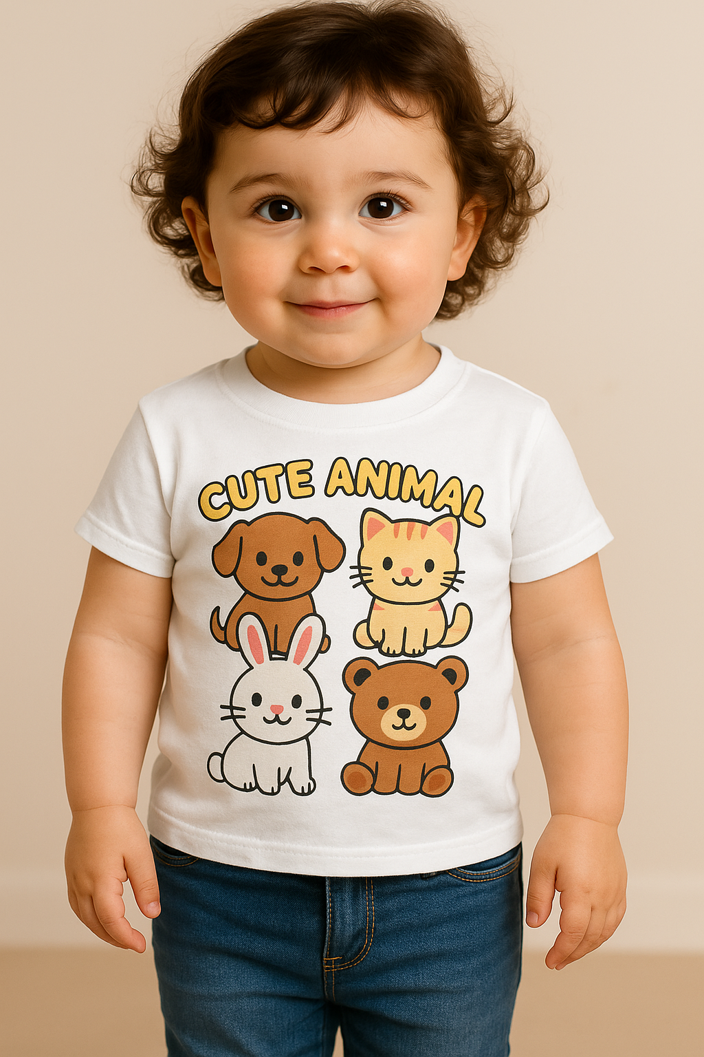 Let your little one show off their love for furry friends in our adorable “Cute Animal” graphic T-shirt! Featuring a playful design of a puppy, kitten, bunny, and bear, this tee is a cozy and charming addition to any toddler’s wardrobe. Crafted from soft, breathable cotton and designed with comfort in mind, it’s perfect for everyday wear, playdates, or photo sessions.