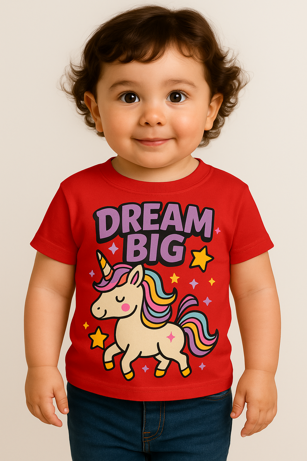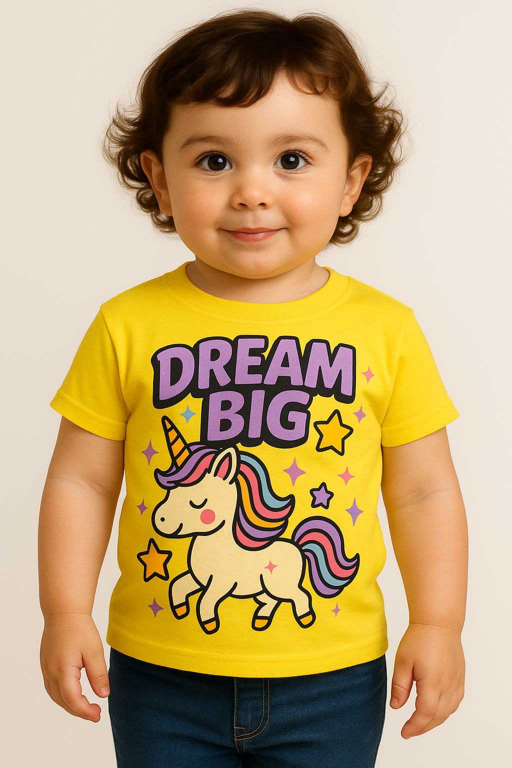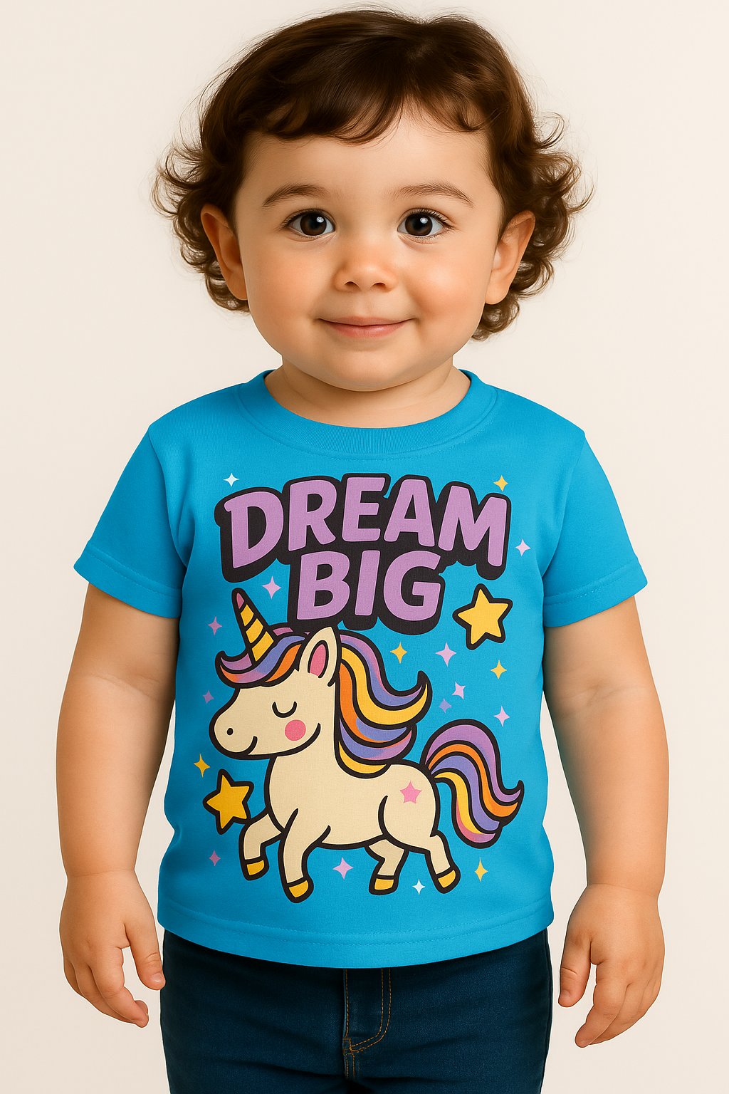 Let your little one shine in this “Dream Big” unicorn T-shirt—made from soft cotton and bursting with color, magic, and inspiration!